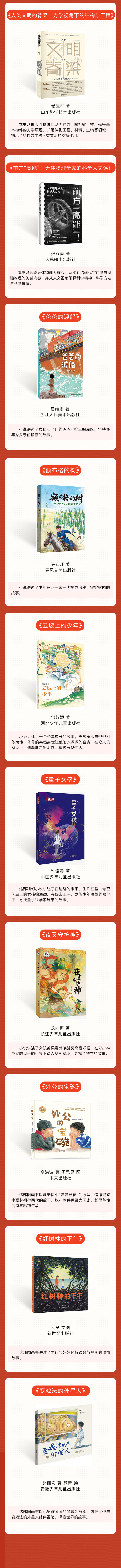 《望山河》《南海:历史与现实》《中国之名 星海之约:给重大科技成果冠上中国名》《大国小农:城市化进程中的农民》《中国早期城市与文明起源》《访古寻踪:文化遗产里的中国》《咸的玩笑》《橘红》《中国画艺术十讲》《王羲之:神采为上》《人类文明的嵴梁:力学视角下的结构与工程》《前方“高能”!天体物理学家的科学人文课》《爸爸的渡船》《额布格的树》《云坡上的少年》《量子女孩》《夜叉守护神》《外公的宝碗》《红树林的下午》《变戏法的外星人》入选。