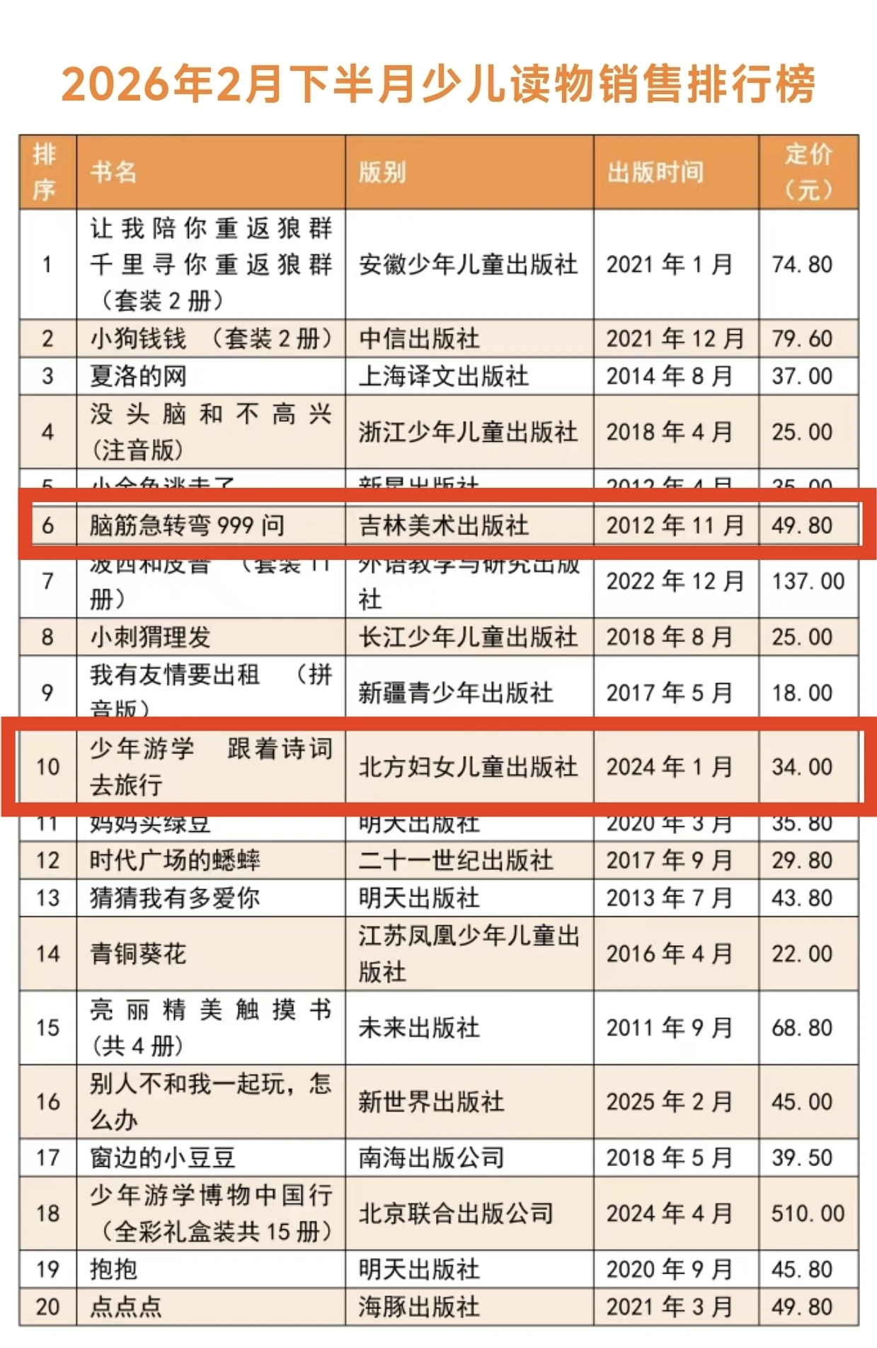 3月10日,中国出版传媒商报公布了全国2026年2月下半月畅销书排行榜,吉林美术出版社和北方妇女儿童出版社共2种图书上榜。